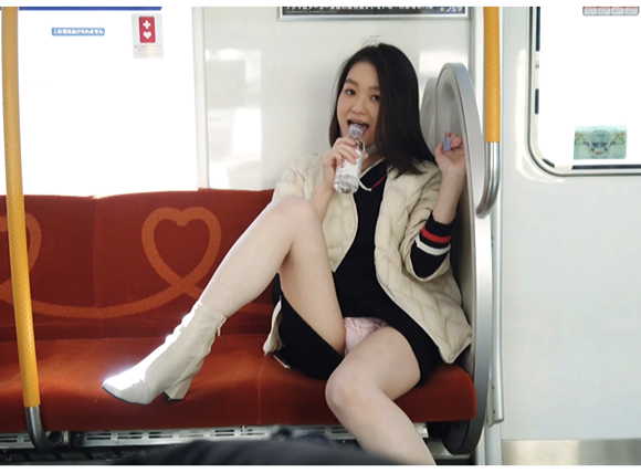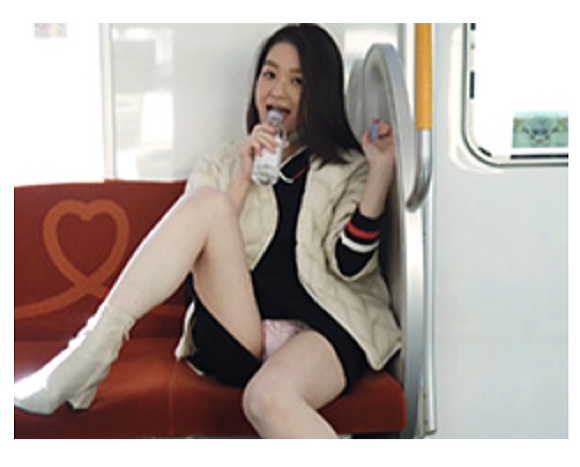 ミニスカ制服女子を追跡。電車対面に座る。カメラをかまえる。もう完全にバレバレ。余裕の笑顔で誘惑パンチラ。カメラ目線でスカートひらり。パンティチラチラさせて超エロい。ペットボトルをオチンポみたいにさわる。