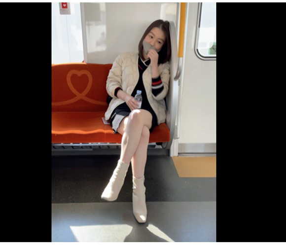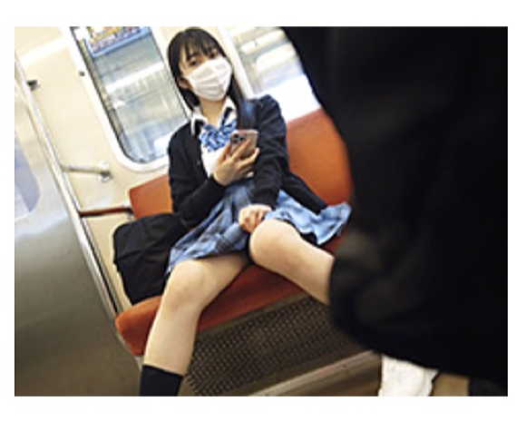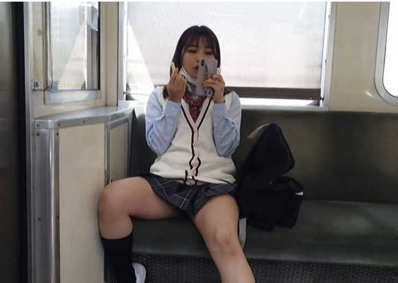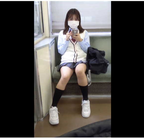 商店街を駅方面へと向かう制服JKを追跡。ホームで彼女を発見。下り方向なら…と同じ電車に乗り込み対面席も無事に確保。乗客もまばら、すいてる時間帯の電車ゆえガラガラになる。ならば…とスマホで動画を見てる風を装いながらREC。