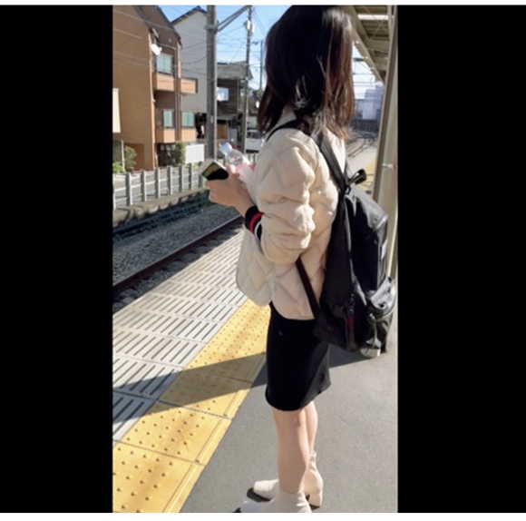 駅方向にさっそうと歩くJK発見、慌ててカメラを回して追跡しました。ホームにたたずむ彼女。清純な雰囲気が漂います。とても綺麗な脚をしています。彼女の対面に座ります。