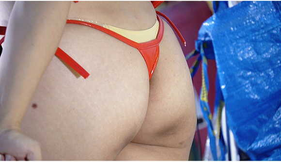 赤のあのバーガーっぽいマイクロビキニのコスプレイヤーさんです!最初はエプロンしてたんですが、わざわざたくし上げて中を見せてくれるサービス精神旺盛な露出大好きっ娘ですwwwそして当然のようにエプロンを脱いでスレンダーなボディを見せてつけてくれますw脱ぎ慣れてる感じだったので処理は完璧かと思いきや、後ろからよく見るとお毛々が……wこれもサービスの一環なんですかねwww