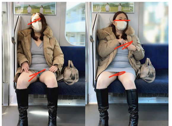 爆乳の若い女性のパンチラを電車で盗撮!すごいおっぱいです。欲求不満なんですね。